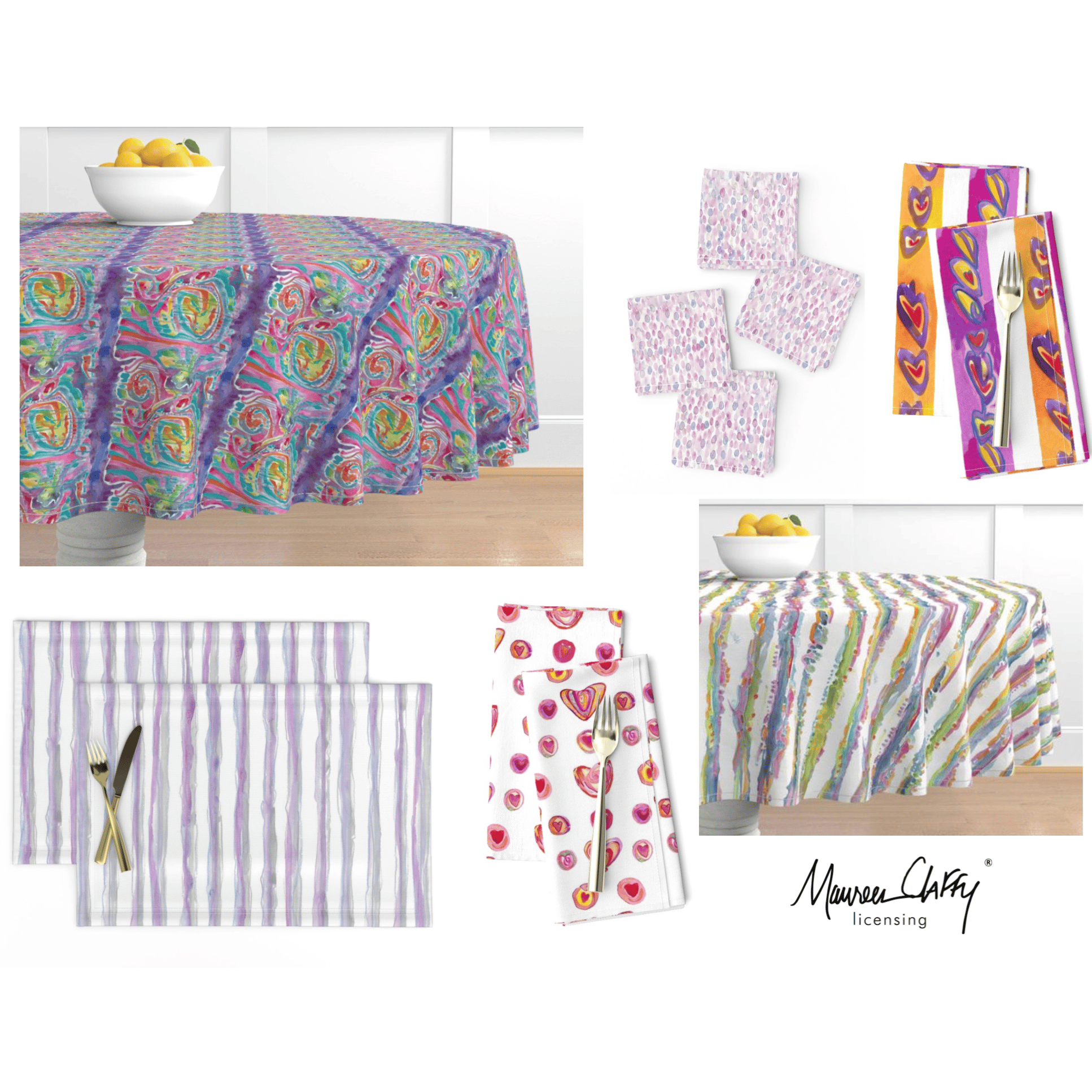 If you’re interested in bringing brightness and color into your home, beautiful home products featuring my art are now available on Spoonflower. There are tablecloths, pillows, curtains, wall hangings and much more. Available on Spoonflower.